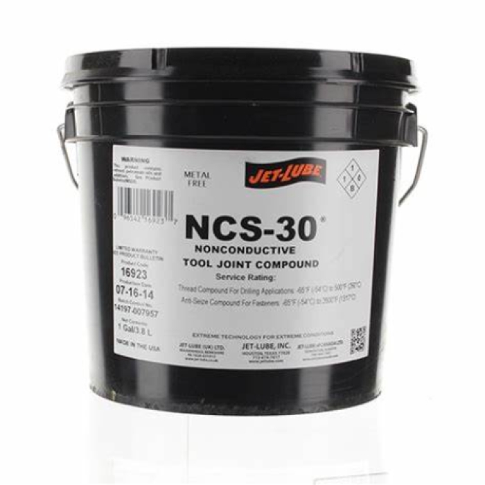 NCS-30® is a premium quality, nonmetallic compound containing carbon based fibers and additives, and other natural extreme pressure and anti-wear additives. These are blended into Jet-Lube's high temp calcium complex base grease. This base grease offers the additional advantage of superior adhesion to wet steel surfaces, resistance to water wash-off, and most drilling muds. It's especially effective for invert or high-pH muds.