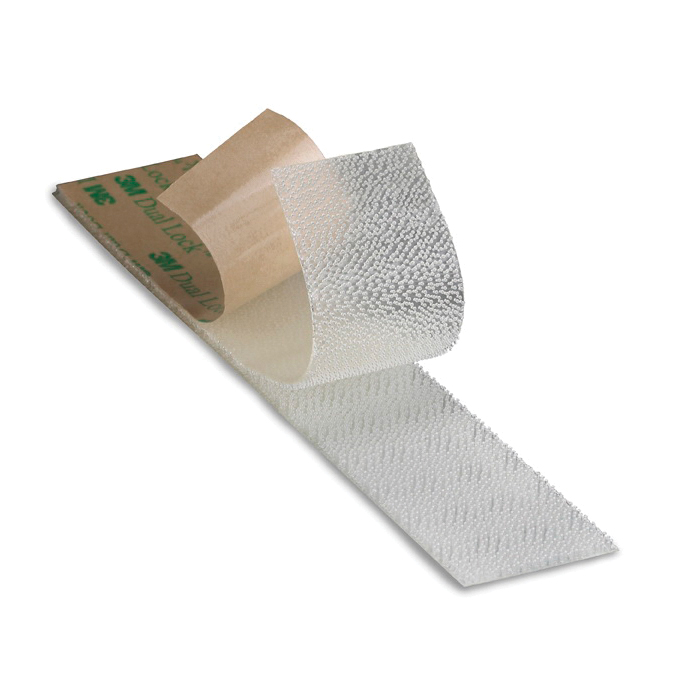 3M™ Dual Lock™ reclosable fastener SJ4570 low profile is a low surface energy adhesive on the back of a clear polypropylene reclosable fastener. This product is half the thickness of standard 3M™ Dual Lock™ reclosable fasteners, providing a low profile attachment. An alternative to screws and bolts, this hidden fastener provides a snug fit and smooth aesthetic appearance. 3M™ Dual Lock™ reclosable fastener SJ4570 low profile is designed for indoor use and low to medium temperature performance. This product offers temperature resistance up to 158 deg F and can be used with metals such as aluminum and stainless steel, as well as glass, many plastics (polypropylene, polyethylene, polycarbonate, ABS) powder coated paints and medium to low surface energy materials. 3M™ Dual Lock™ reclosable fastener SJ4570 low profile consists of interlocking mushroom shaped heads that easily slide over each other, allowing for positioning of parts before being snapped together. This fastening process creates a durable attachment and provides fast product assembly with great design flexibility. 3M™ Dual Lock™ reclosable fasteners sound an audible snap when secure, which verifies closure of the attachment. To disengage, simply peel the pieces apart by hand. Our fasteners maintain their strength throughout multiple attachments and detachments. A lightweight alternative to metal fasteners, this product remains hidden beneath surfaces and does not interfere with the integrity of your material-providing aesthetic improvements and design flexibility. When two pieces of 3M™ Dual Lock™ low profile reclosable fasteners mate, the stems flex and the mushroom heads slide past each other. After passing the opposing mating piece, the stems snap back into their original position and the opposing mushroom heads interlock. These fasteners can provide high tensile strength but can be opened by simply cleaving or peeling open the closure. This product is well suited for many indoor applications where versatile reclosable fastening system is required. Not all design requirements are easily satisfied, but you can simplify your attachments. When you need a strong, reliable, yet removable closure, 3M™ Dual Lock™ low profile reclosable fasteners are the easy alternative to traditional fastening methods such as screws, nuts or bolts.