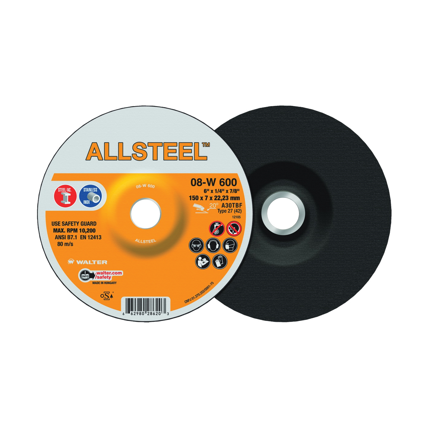 Walter Surface Technologies ALLSTEEL™ Grinding Wheel, Aggressive, Series: 08-W, 6 in Wheel Dia, 1/4 in Wheel Thickness, 7/8 in Center Hole, A-30 Grade, Wheel Type Number: Type 27, 10200 rpm Maximum, Applicable Materials: Stainless Steel and Steel, Yes Reinforced