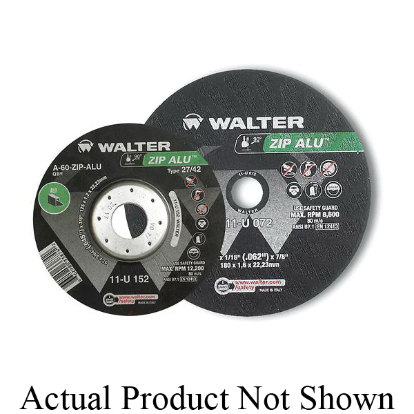 Walter Surface Technologies ZIP ALU™ Cut-Off Wheel, 4-1/2 in Wheel Dia, 3/64 in Wheel Thickness, 7/8 in Center Hole, A-60-ZIP ALU Grit, Medium Grade, Aluminum Oxide Abrasive, 13300 rpm Maximum, Applicable Materials: Aluminum and Non-Ferrous Metals, Wheel Type Number: Type 1, For Use With: Angle Grinders